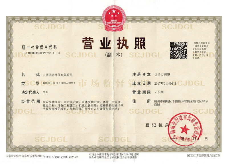 企業(yè)相關(guān)手續(xù)齊全具有危險(xiǎn)廢物經(jīng)營(yíng)許可證、道路運(yùn)輸許可證,主要承擔(dān)朔州市行政轄區(qū)內(nèi)各家醫(yī)療機(jī)構(gòu)產(chǎn)生的醫(yī)療廢物處置工作,各種危險(xiǎn)廢物的運(yùn)輸工作。